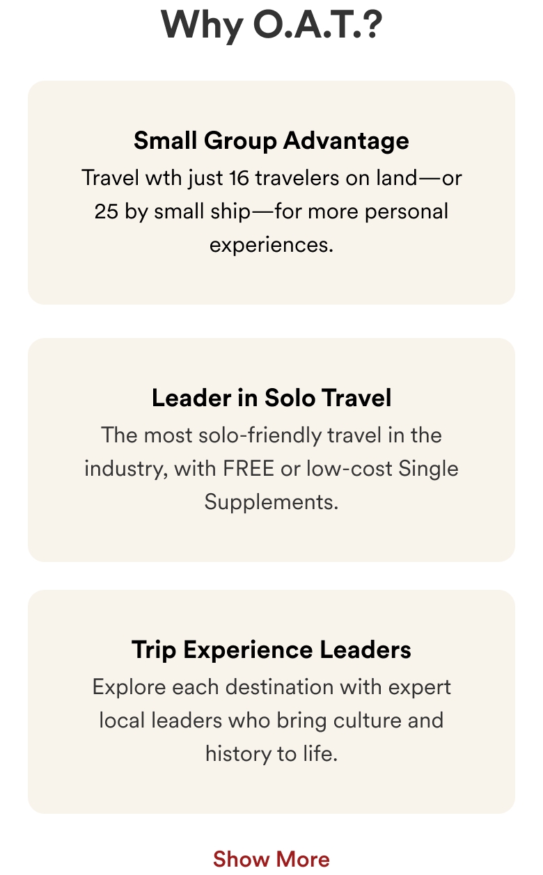 We recommend upgrading your browser—simply click the button below and follow the instructions that will appear. Updating will allow you to accept Terms and Conditions, make online payments, read our itineraries, and view Dates and Prices.