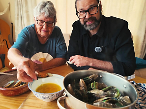 Back in his kitchen, Mike prepares the mussels with his mother Mary. His method is refreshingly simple: steam the mussels with water for about five minutes, then serve with garlic butter. "Some people would use wine at this step, but I'm not going to waste good wine," he laughs. "I don't notice too much difference in the taste."