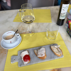 Cured pork fat on crostini in Marina di Carrara—because one should never count calories in France and Italy.