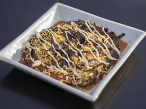 1. 10. Flip the okonomiyaki again and add toppings: okonomiyaki sauce first, then mayonnaise (many Japanese restaurants will squirt the mayonnaise in a crosshatch pattern), then sprinkle katsuoboshi and other fresh ingredients on top.