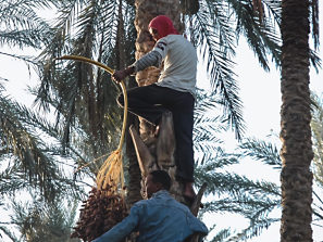 The harvest itself requires quite a show of bravery from Tunisian farmers—climbing the tall date palms without modern equipment is a dangerous task that requires years of experience. Using nothing more than a rope belt wrapped around their waist and the trunk of the palm, harvesters scale the trees with remarkable agility. Once at the top, they carefully cut down the heavy clusters of dates, each weighing up to 20 pounds.