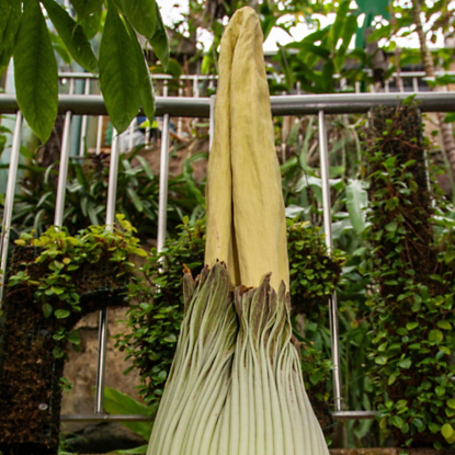 But whatever we choose to call it, the "corpse flower," as just mentioned, hails from the Indonesian island of Sumatra, where there are thought to be only about 300 of the plants left in the wild. The tropical plants grown here can reach up to 9 feet high and 4 or 5 feet in diameter. In its natural habitat, it blooms for just a few days every two to five years, up to five times in its lifetime.