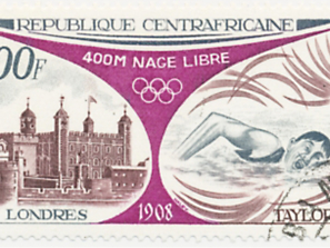 A postage stamp commemorating the 1908 Summer Games, where figure skating appeared as an exhibition sport.