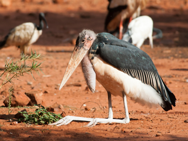 The second bird to make the list is certainly worthy to "carrion" the tradition. These five-foot tall scavengers with close to 10-foot wingspans are among the largest birds in the world. And their pink and featherless head and neck, enormous conical bill, and a fleshy pouch under the neck make them among the ugliest, too. And the marabou stork’s nickname—the undertaker bird—doesn’t help. They’re often seen sharing carcasses with two other members of their exclusive club—hyenas and vultures. They also have hollow legs and feet that make it easier for them to fly. And speaking of legs, you know vulture’s charming habit of urinating on their legs to cool off in the hot African sun? Marabou storks defecate on theirs.