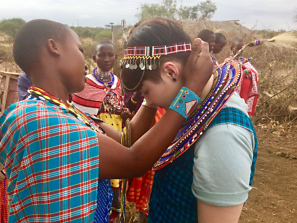 Now Chief Matapatchi introduced Isabelle to the groom Leshoto, a tall handsome Maasai man with long braided hair wearing traditional red clothes which is called a “shuka.” Maasai wear red because it symbolizes their culture and they believe that it scares the lions away. Now, women from the village dressed in colorful clothes decorated with beautiful beads started to dress Isabelle in traditional bridal clothes for the wedding. As the dressing was completed, Isabelle looked like a beautiful, happy Maasai bride.