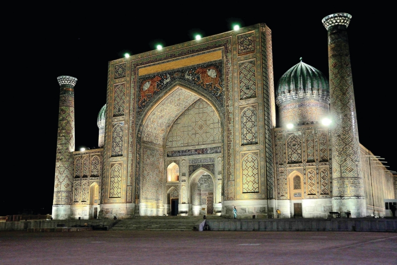 Registan Square at night, located in the heart of the ancient city of Samarkand, which travelers visit on O.A.T.’s The Silk Road: Central Asia’s Ancient Trade Route adventure.
