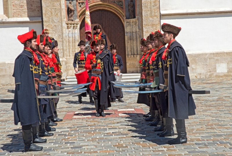 The Cravat Regiment performs a march by the honorary regiment from the Lower to Upper Town of Zagreb, Croatia on weekends and holidays which culminates in a changing of the guard at St Mark's Square.