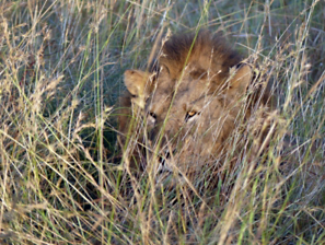 A lion hides in the grass.
