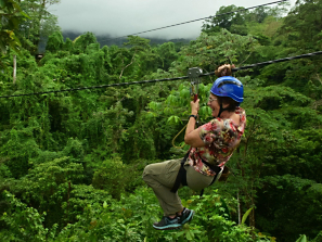 An O.A.T. traveler ziplining in Costa Rica.