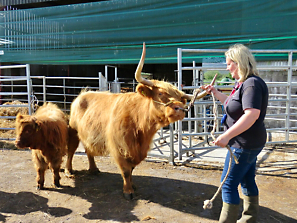 A scheduled itinerary stop led us to the family farm of Grace Noble in Banchory, Aberdeenshire. There, she invited us to "join her herd" of Highland cattle with up close viewing as well as an opportunity to have a "hands on" experience. Although engaged in beef production, Grace also raises coos to display and for educational purposes. Through her constant interaction with them, these massive bovines become accustomed to human contact and especially enjoy having their shaggy hair brushed. We each welcomed the opportunity to comb a mother and her calf during our stay.