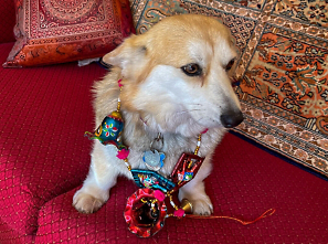 Yvonne has a tradition of posing her pups—in this case, Miss Pearl—with souvenirs from her adventures.