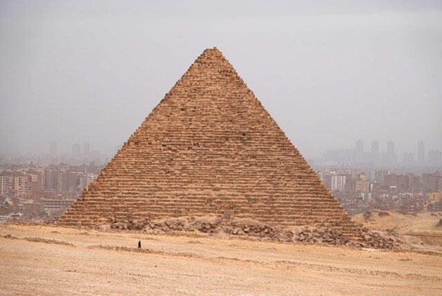The Khufu Pyramid west of the city of Giza, the downtown towers of Cairo in the haze beyond.