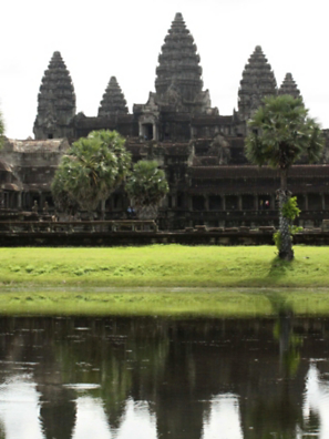 The intricate temples of Angkor Wat reflected in the surrounding moat.
