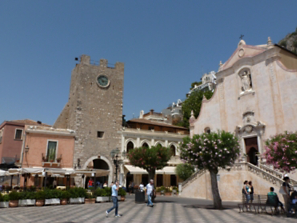 Aside from exquisite shops, Taormina's narrow pedestrian streets lead to an open square with wonderful architecture that looks over the bay.