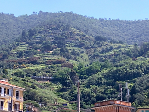 We stop at Vernazza, the second largest town and enjoy exploring this quaint village. The church in the center of town seems a bit like a fortress and is quite dark inside with stone walls. There is little decoration but definitely a feeling of the faith of the people who have worshipped here for so many years. The muffled sound of the church bell connects us to all the faithful here. We see Corniglia from the boat as there is no harbor. The colored buildings, seemingly stacked together, look like something from a fairy tale. In looking at the fertile terraces in the distance, we appreciate the joining of man with nature which produces the products we associate with Italy.