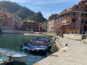 Colorful wooden boats are docked along the charming village of Vernazza.