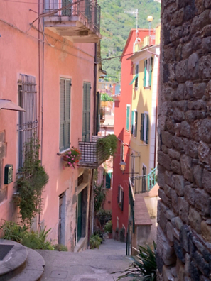 We head east out of Genoa leaving the city behind and soon are driving through the countryside with trees covering the hillsides. We pass through many tunnels being thankful for the engineering that built them. As we leave the main highway the road descends, with tile roofed houses dotting the hillsides or grouped together in distant valleys. On each side we see terraces on the hillsides designed for agriculture—olive, orange, and lemon trees abound. We pass buildings often painted salmon, yellow, or white. They offer a charming pattern to the scene. We pass through a village with an imposing church in the center, obviously the essential part of the lives of the residents for many years.