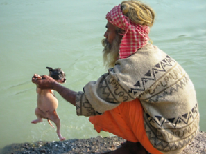 An Indian man washing his little puppy dog in the river Ganges.