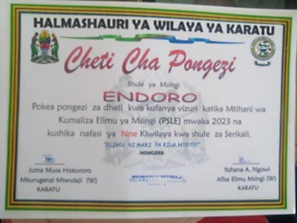 A certificate of recognition commemorates the achievements of Endoro Primary School.