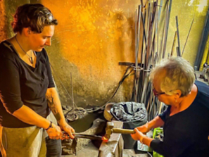 Sue Woodruff, 15-time traveler from Norton Shores, MI, tries her hand at blacksmithing.