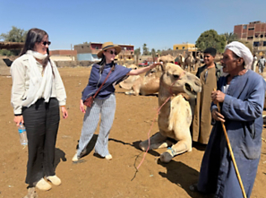 We spent the morning visiting Daraw, a non-touristic city on our itinerary. As part of our learning and discovery, we got an exclusive opportunity to interact with the locals and visit a few markets. Daraw is known for its camel markets, which only happen two times a week on Saturdays and Sundays. It was just our luck that we would be visiting Daraw on Sunday! Once we got off our dahabeya, we hopped on a motorboat and took a short ride to Daraw. Upon arrival, we hopped in the back of a pickup truck and zipped down a dirt road toward the camels. Tuk-tuks and motorbikes zoomed past us, honking their horns and waving at us Americans as we passed them by.
