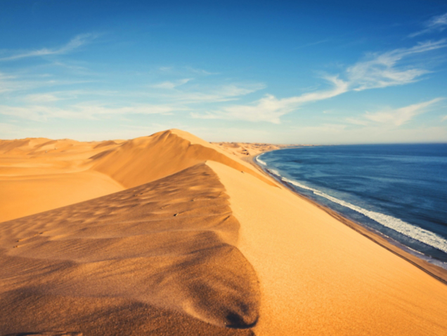 Massive dunes plunge into the sea at Sandwich Harbour—a highlight of our New! South Africa & Namibia: Cape Town’s Winelands to the Skeleton Coast adventure.