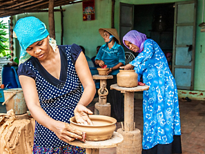 For Vietnam’s Cham ethnic minority group, pottery skills are a sacred inheritance. According to legend, the knowledge of crafting ceramics was bestowed by a god—and those ancient, divinely ordained techniques are still in use today. Rather than using wheels or turntables to spin vessels into symmetrical shapes, the craftswomen spin themselves around the clay, smoothing and polishing the surface with simple tools such as bamboo hoops, then pressing shells and flowers into the surface for decoration. The colors applied to the pottery also have natural origins: cashew nut shells, tree bark, and other organic materials are soaked in water until it’s tinted enough to stain the pieces.
