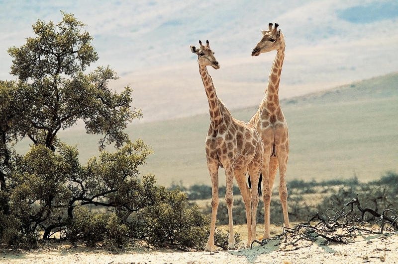 With their long necks and legs, giraffes are the tallest land animals in the world. Native to Africa, these gentle giants can reach heights of up to 18 feet. Their distinctive spotted coats provide camouflage in the grasslands and open woodlands where they live. When seen in groups, often browsing treetops for leaves, these majestic creatures form what's known as a "tower" of giraffes.