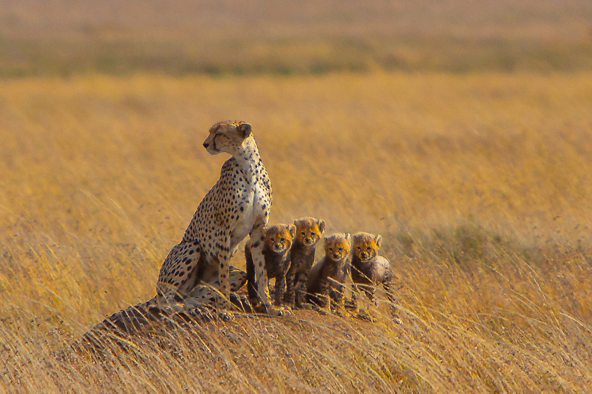 Comments from the judges: While another photographer may have cropped this photo closer, we like the additional surrounding area that is shown here. By including the grass, the photographer creates a depth of field—not to mention, all of the cubs are looking curiously at the camera.