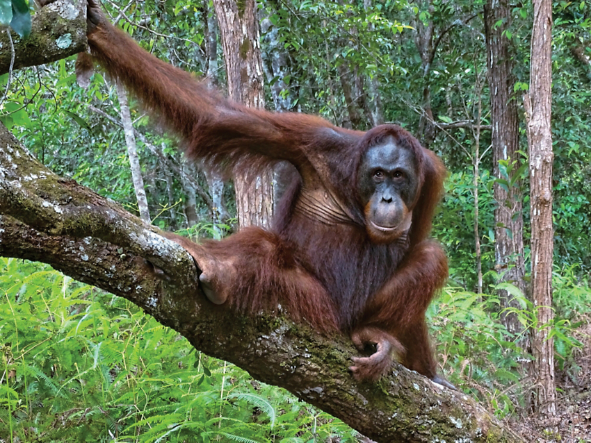 Comments from the judges: The scene is dramatic, as though the orangutan were posing for an audience. The framing captures his size through the length of his arm, and his gaze creates a connection with the viewer.